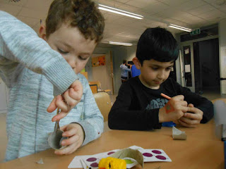 Aujourd'hui, nous avons fait des petits lapins en carton, nous sommes allés un petit moment dehors et nous avons préparé une petite exposition et l'apéritif pour les parents.